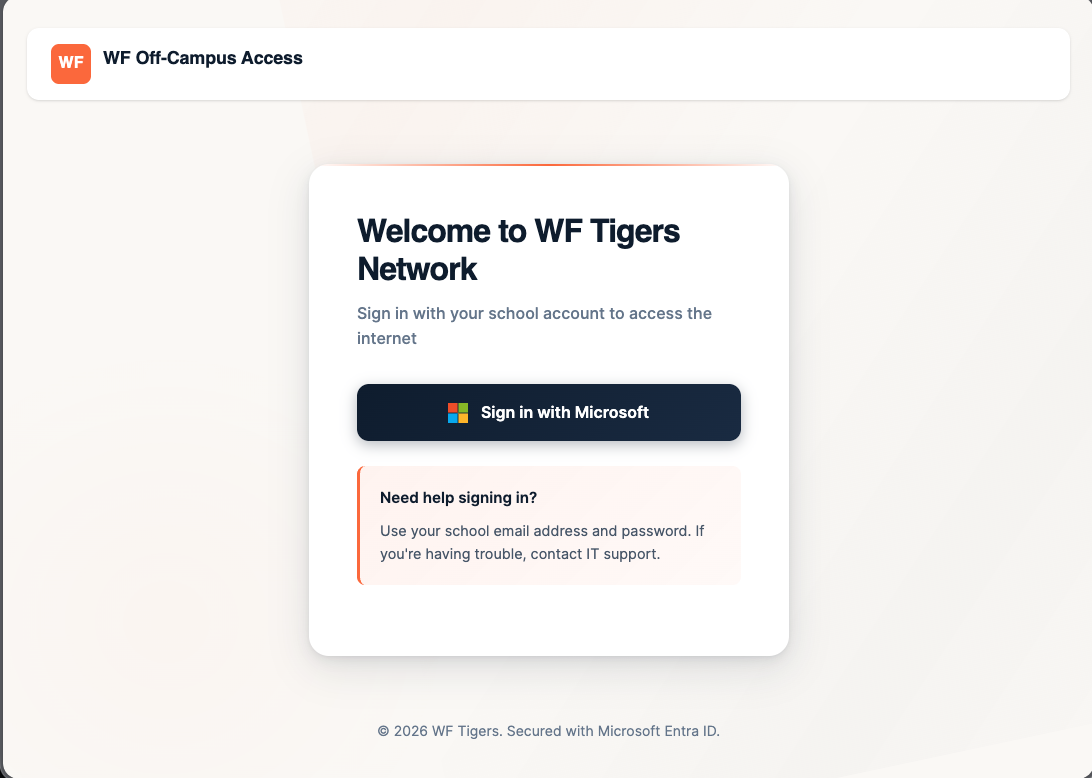 To access the login page, either visit https://proxy-login.wftigers.org or click on the "Off-Campus Access" button found in your new-tab page.